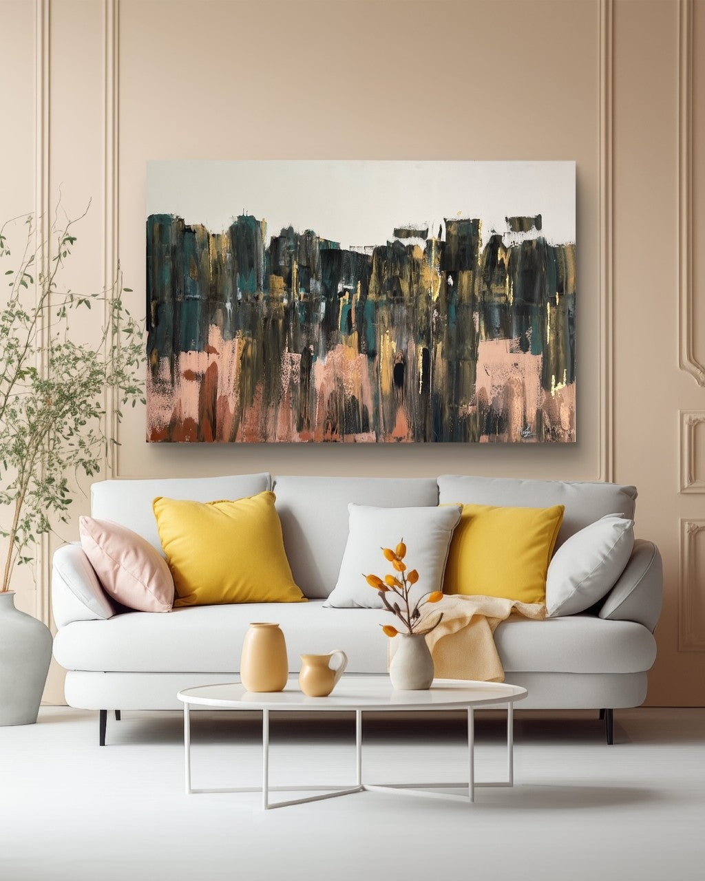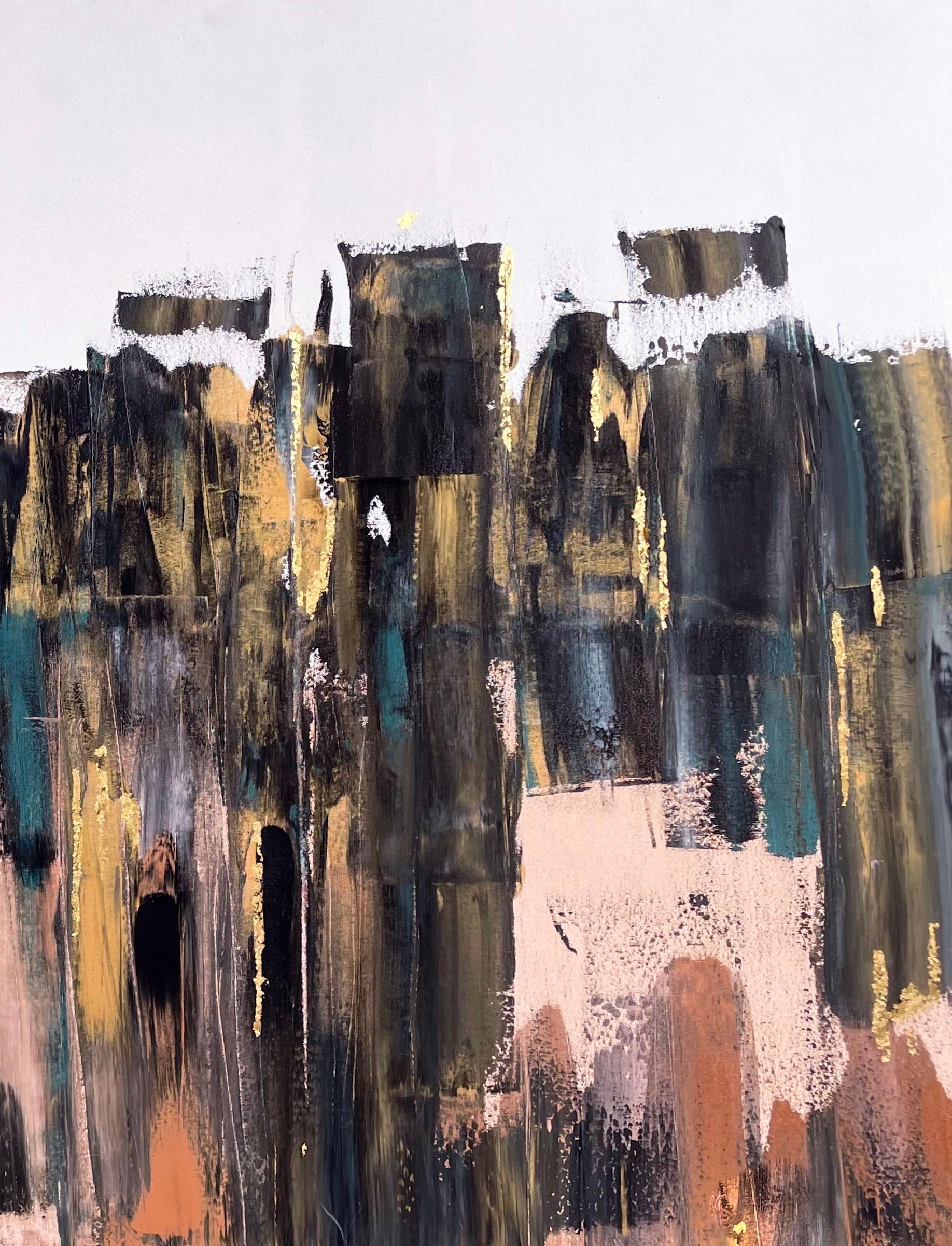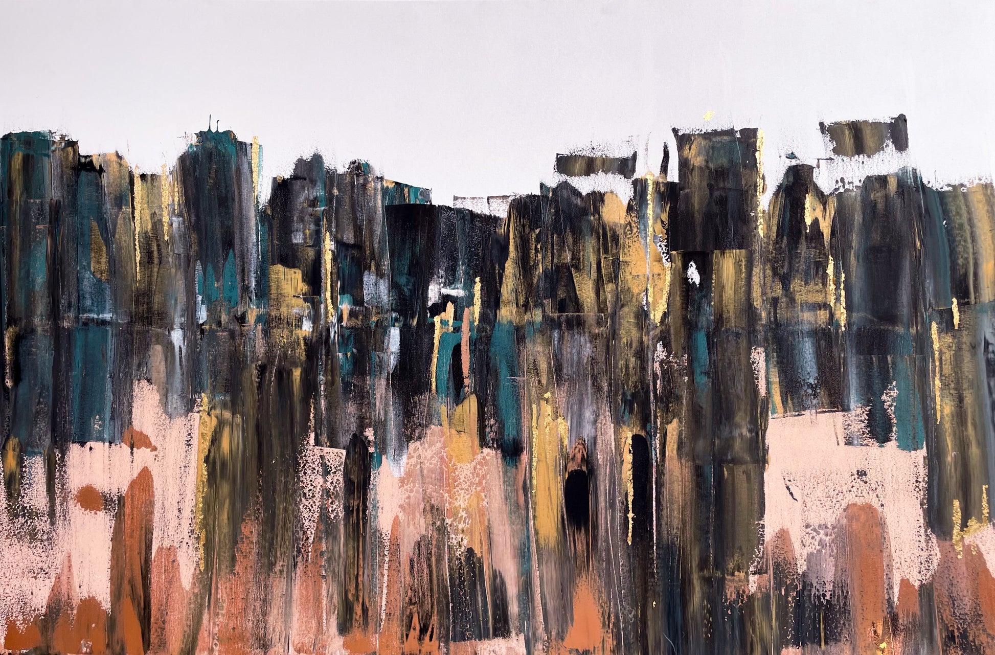 In Echo of emotion, the artist processes a deeply personal moment of emotional tension—an argument that left more unsaid than spoken. The expressive vertical structures evoke the silhouette of a fragmented city at dusk, both elusive and heavy. Layers of dark tones are interwoven with strokes of gold, rust, ochre, and pale pink, creating a visual field charged with conflict and a quiet search for clarity.