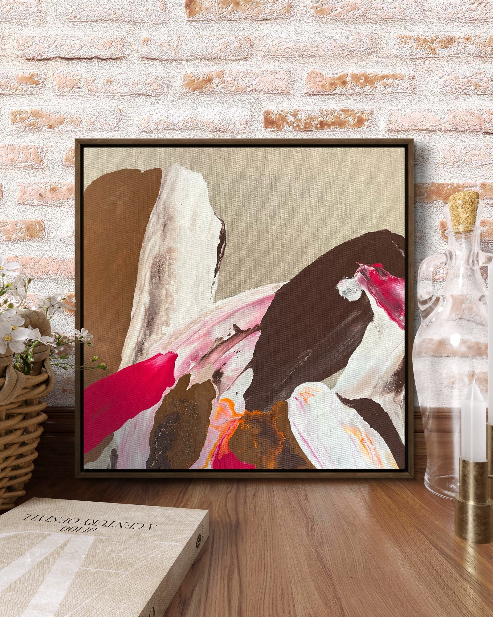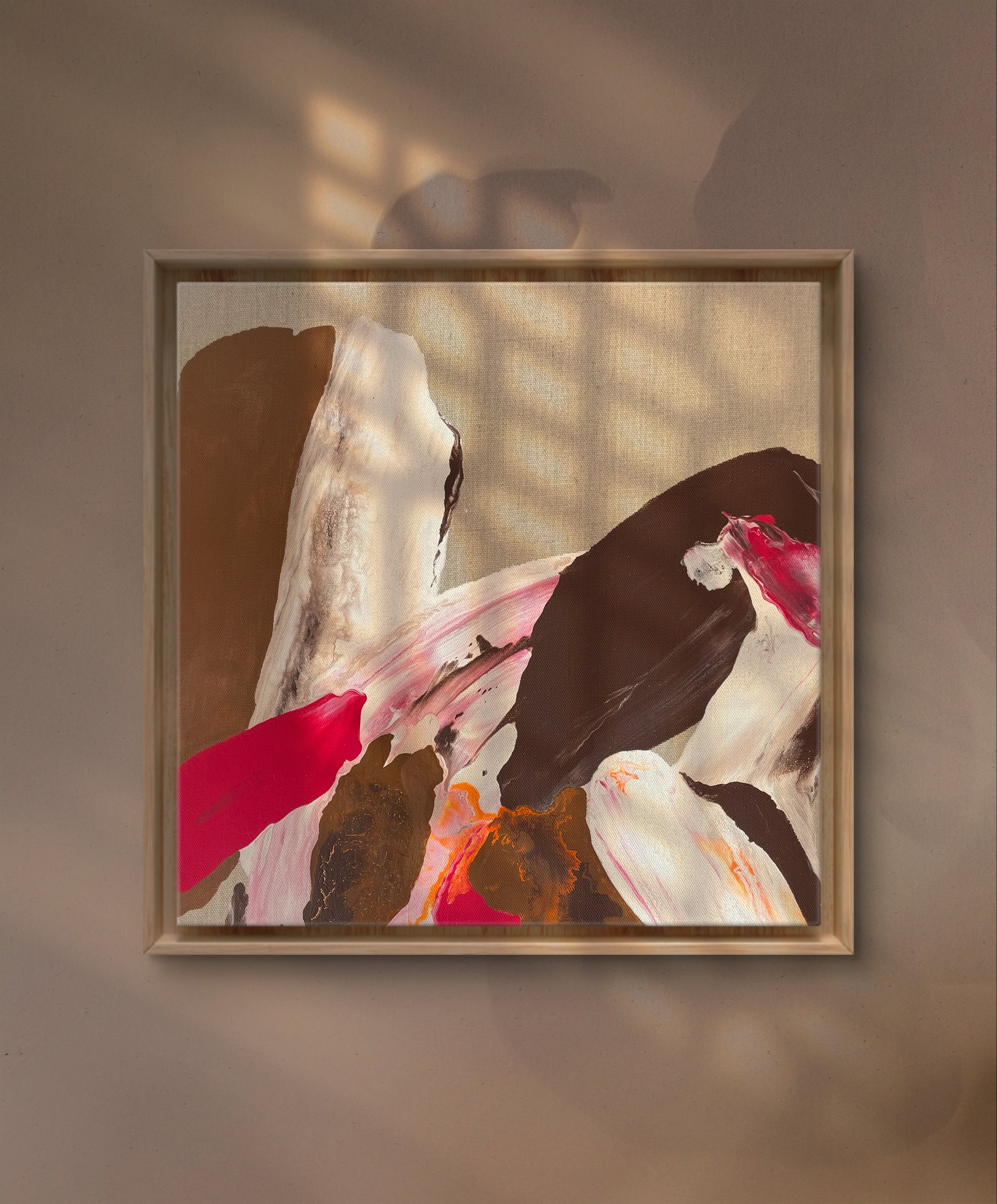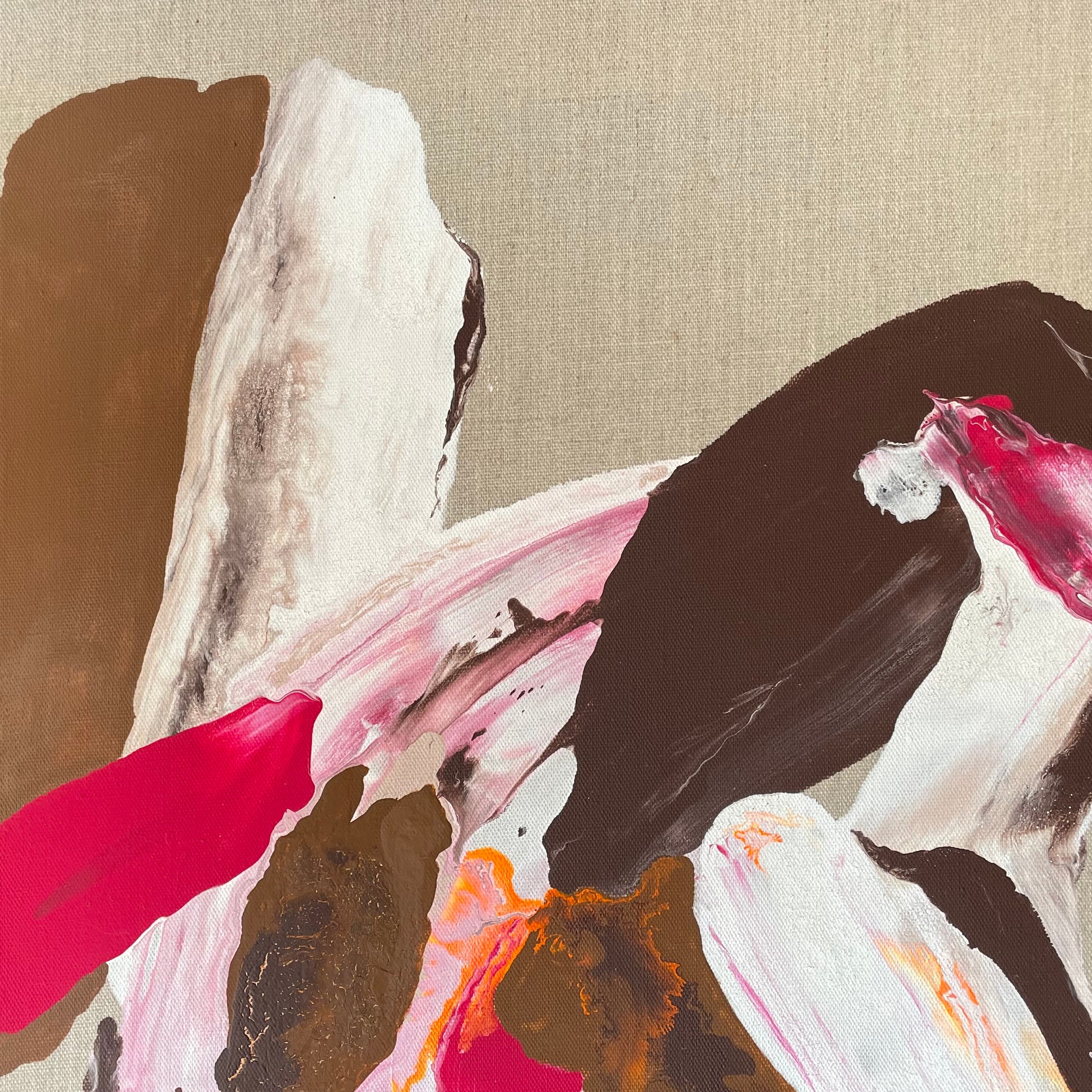 Wie eine Perle, verborgen in den Tiefen des Meeres, trägt dieses Werk seine Kostbarkeit im Inneren. Die Schichten aus Braun, Pink, Orange und Weiß verweben sich zu einer Oberfläche, die zugleich offenbart und verschleiert.