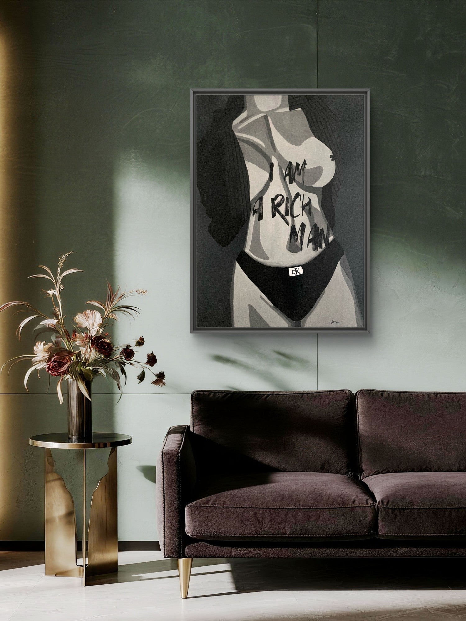 Die Komposition kombiniert Körperlichkeit mit einem starken, selbstbewussten Statement, wodurch eine Spannung zwischen Sinnlichkeit, Konsumästhetik und gesellschaftlicher Botschaft entsteht.
