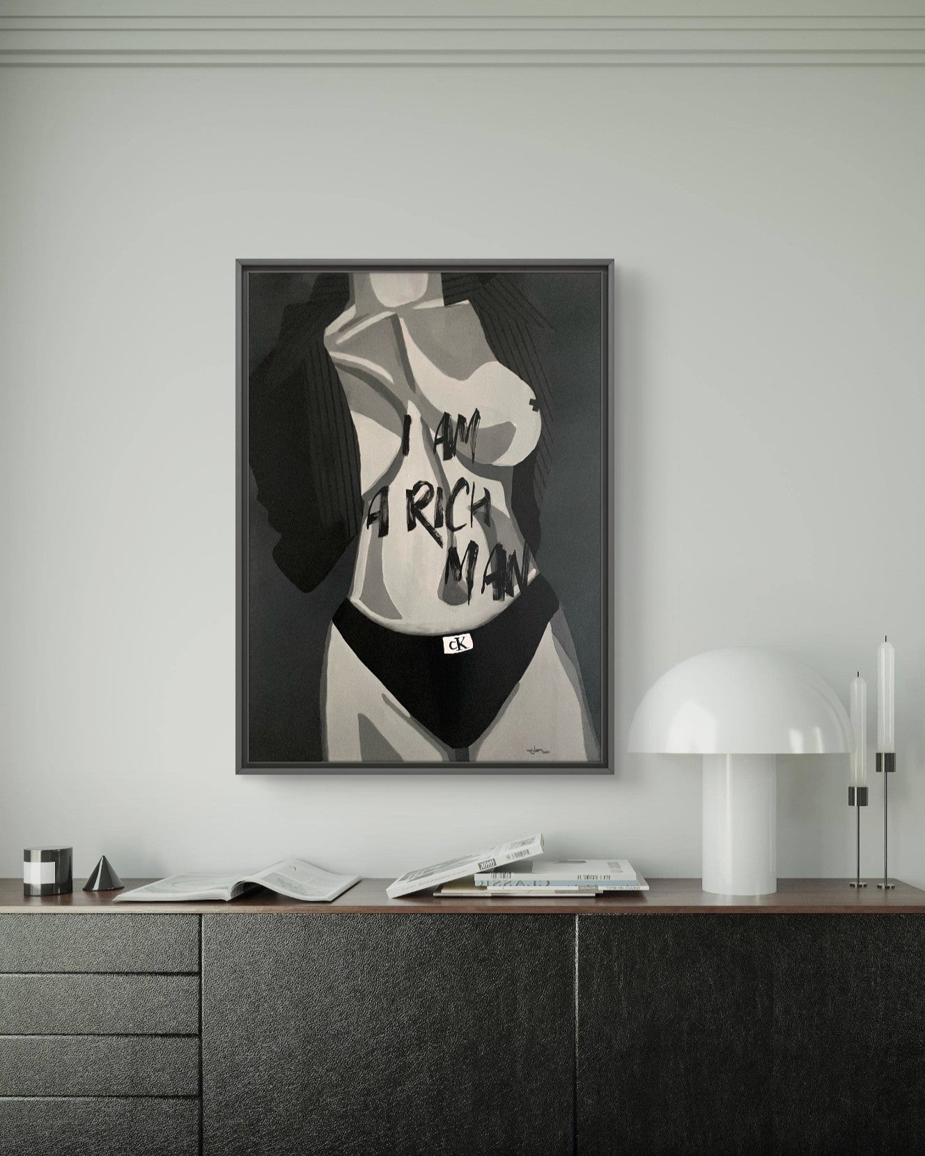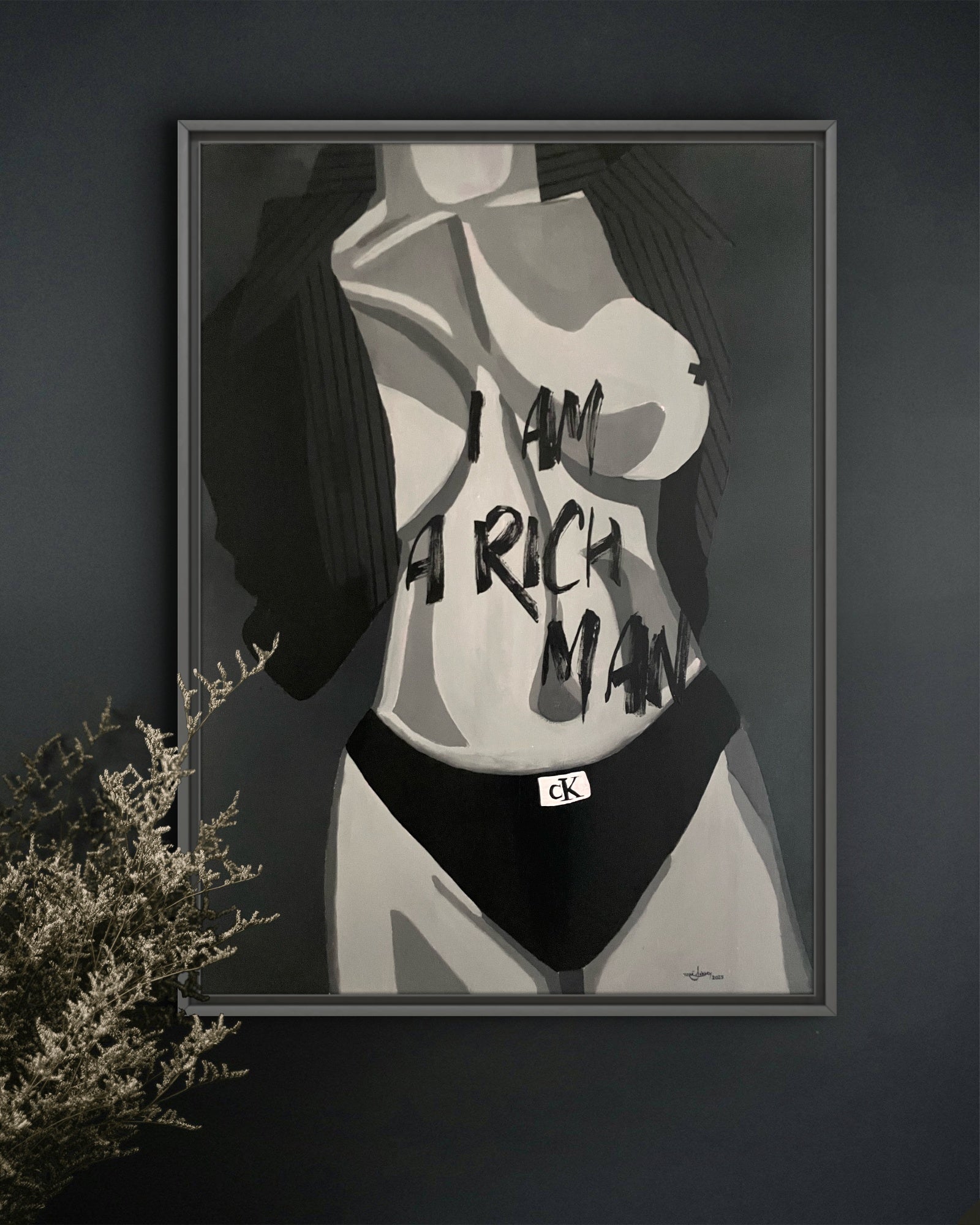 The composition combines physicality with a strong, confident statement, creating a tension between sensuality, consumer aesthetics, and social commentary.